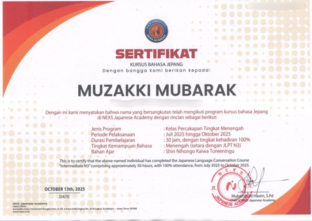 NEXS Academyでの学習 2025年7月から10月まで、NEXS Academyで30時間の会話コースを修了しました。出席率は「100%」です。『新日本語の会話トレーニング』を使い、中級の練習をたくさんしました。